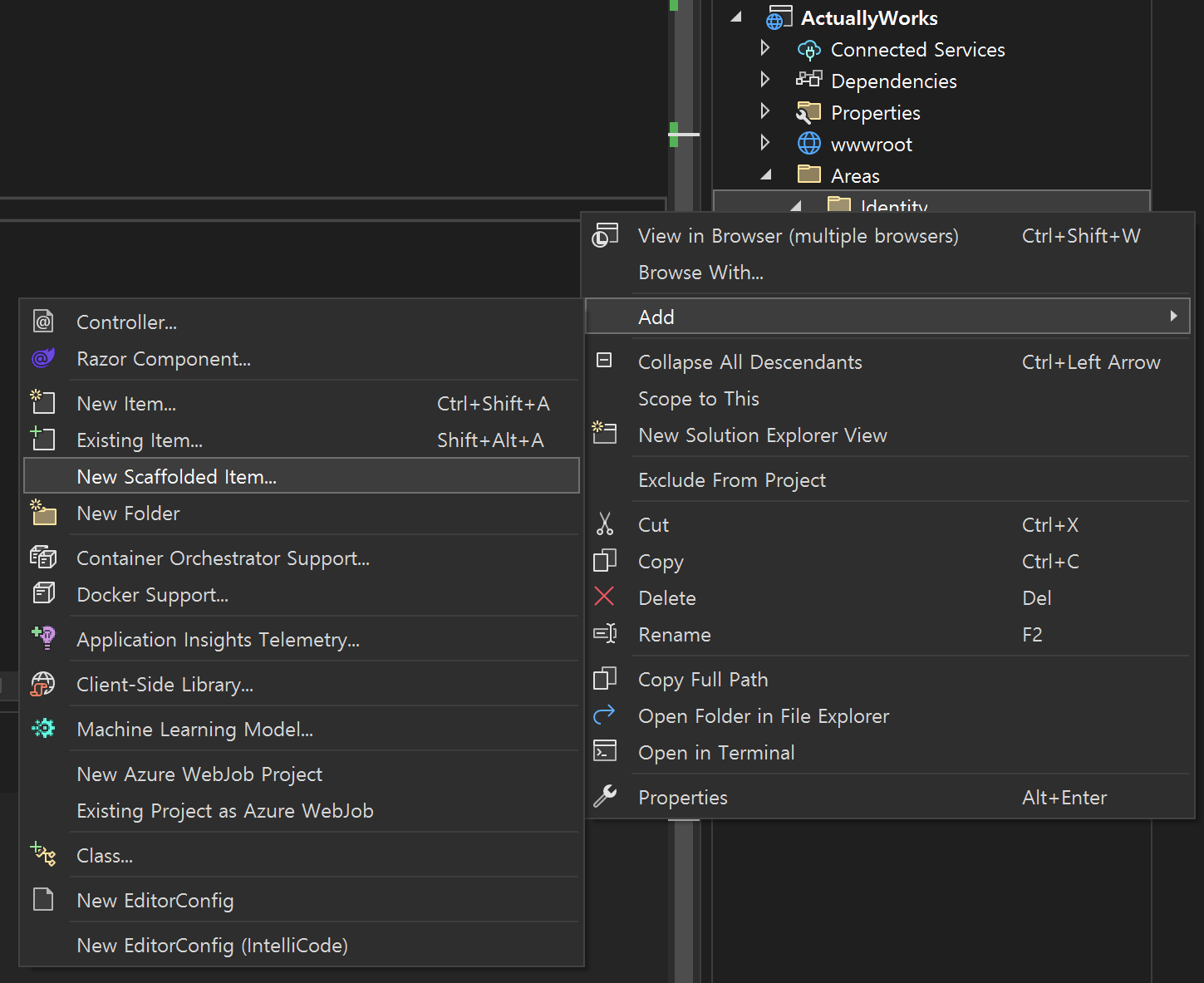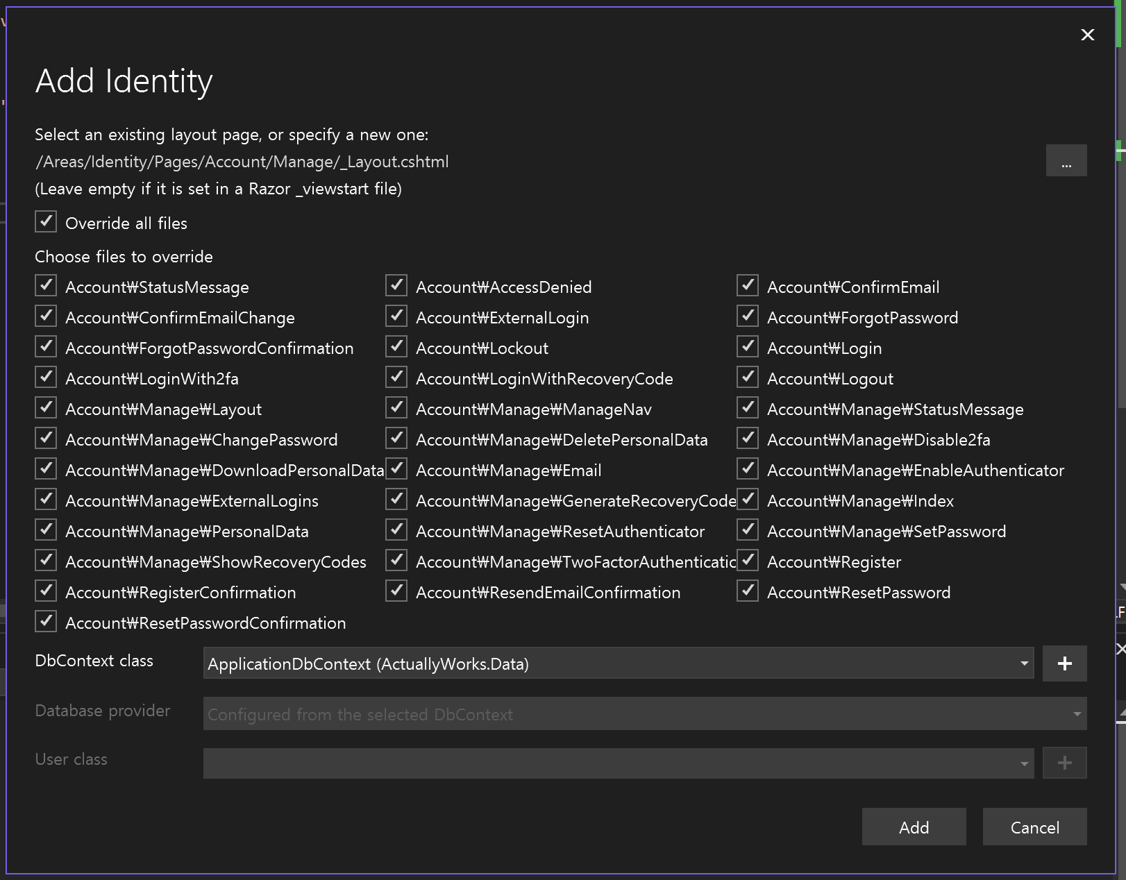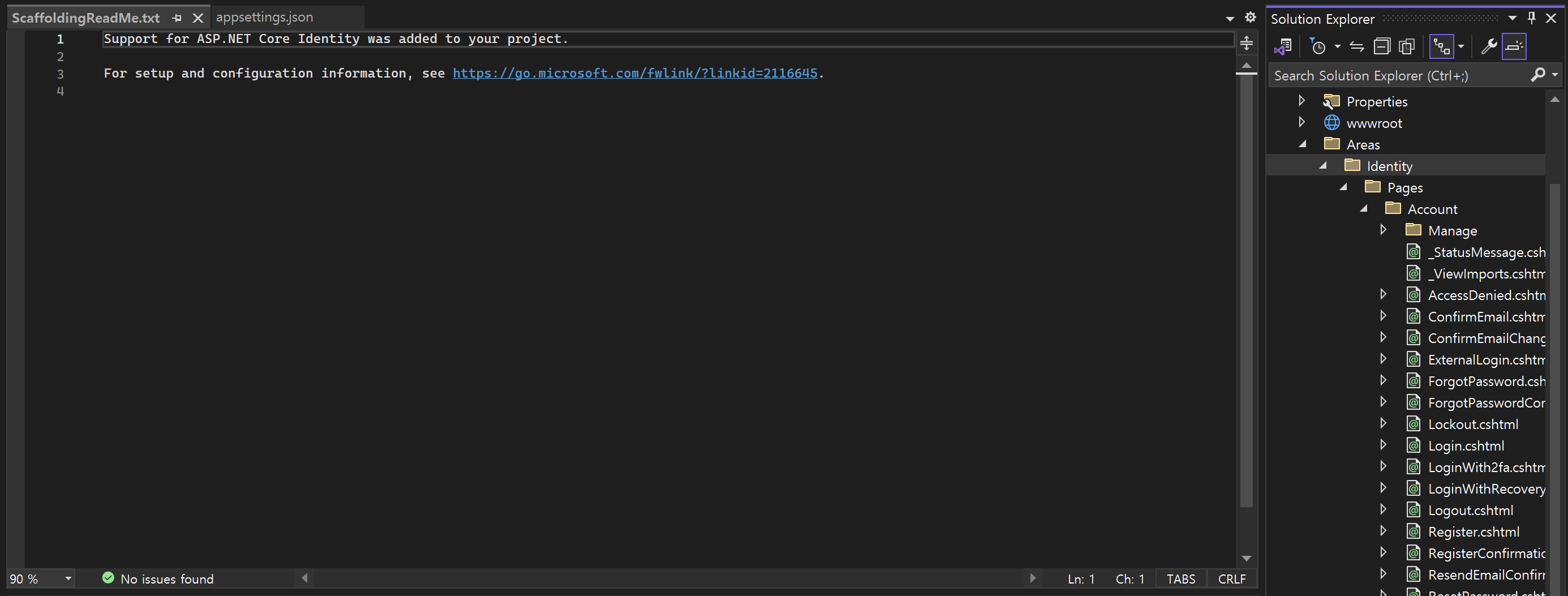 생성이 완료되면 Identity 폴더 내에 View파일(*.cshtml)들이 생성된 것을 확인하실 수 있습니다.