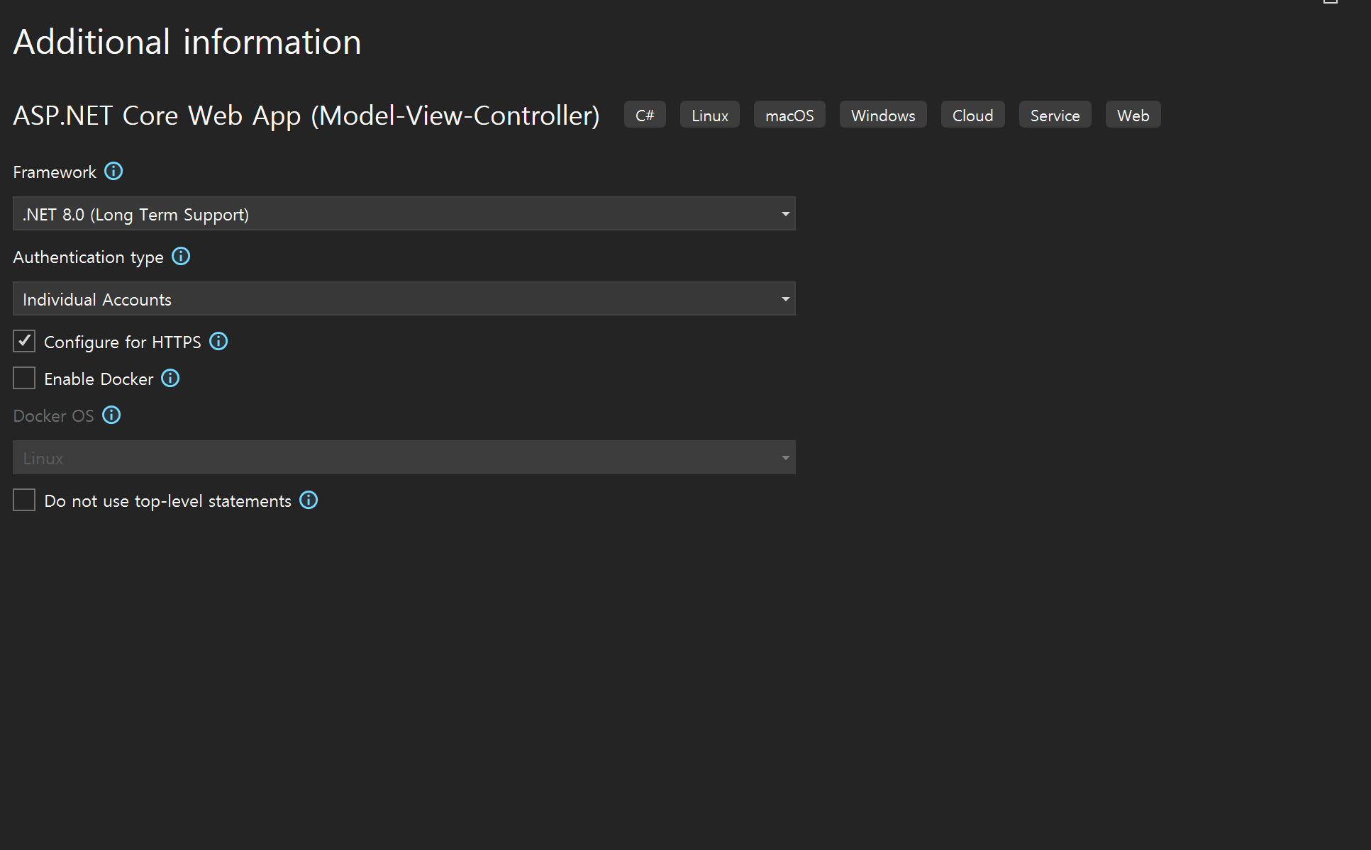 프로젝트 생성 시 HTTPS 옵션을 설정 시 HTTPS 로 실행이 가능하며, 옵션 미설정 시 버튼이 다르게 나올 수 있습니다.
